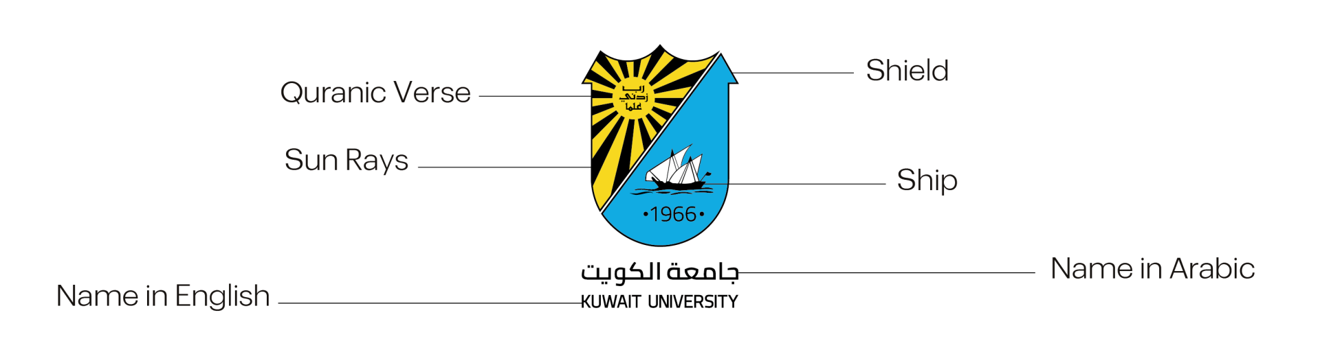 Since its establishment, Kuwait University stood out by its unique logo that reflects the Kuwaiti culture and distinguishes it from other neighboring countries. The logo became an original symbol for Kuwait University for more than 55 years. Therefore, all efforts were made not to obliterate any of the original logo components in the updated design of the logo, to preserve its spirit and uniqueness. The main components of the KU logo start with the University name along with the shield of Kuwait University, which contains (The Dhow, the sun, the Quranic verse, and the year of establishment).